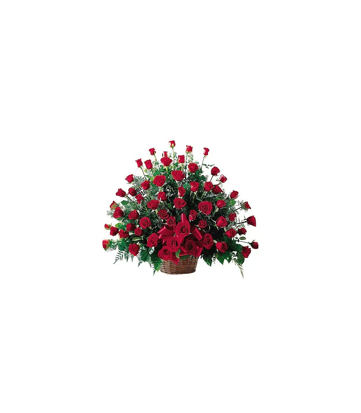 Sorprendente canasta de rosas rojas. Elegante presentación de 60 rosas en canasta ideales para impactar en cualquier ocasión especial.
