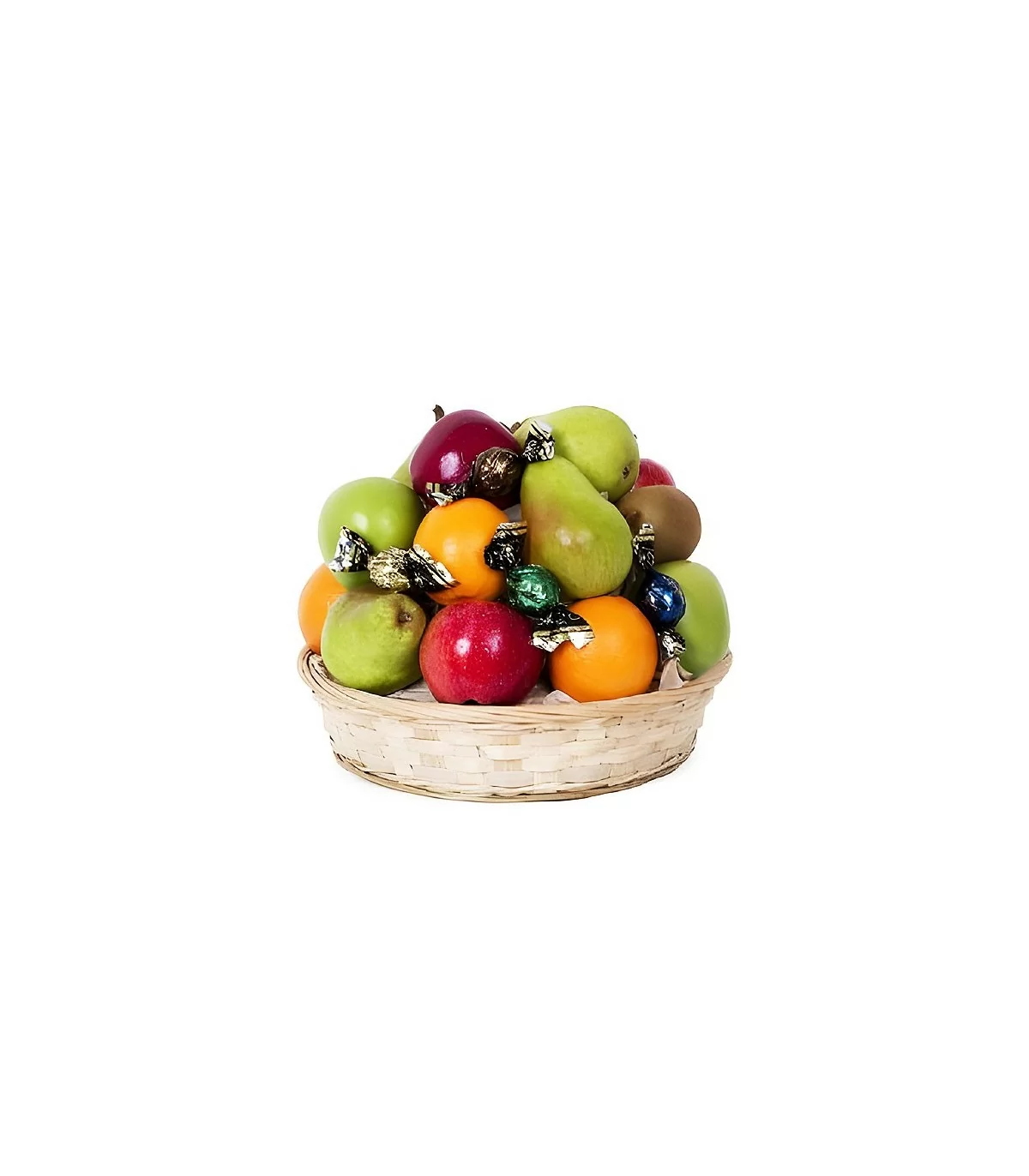 Una deliciosa canasta mezcla de frutas de temporada acompañadas de un surtido de chocolates.