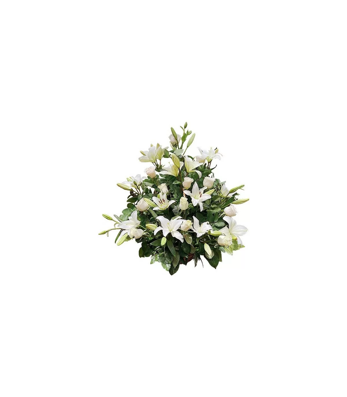 Esta hermosa canasta es una forma maravillosa de honrar la memoria de tu ser querido. Se compone de 12 rosas blancas y 12 liliums blancos, todo ello arreglado a mano para crear una presentación impresionante. Las rosas blancas representan respeto y recuerdo, mientras que los liliums blancos evocan la tranquilidad y la nobleza del alma. Este arreglo fúnebre no solo es una expresión de afecto, sino también un consuelo que brinda serenidad en momentos difíciles.