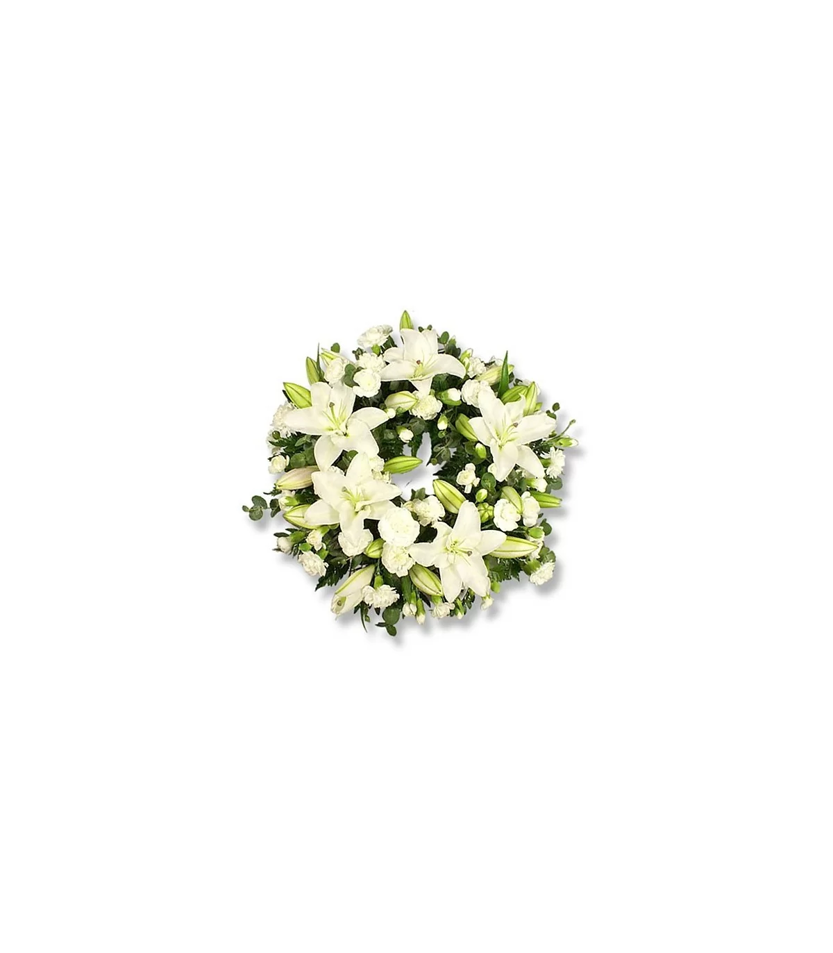 La corona fúnebre de liliums es una expresión conmovedora para ofrecer tus condolencias en este momento difícil. Haz que esta elegante corona de flores transmita tu afecto y apoyo en un momento de pérdida.