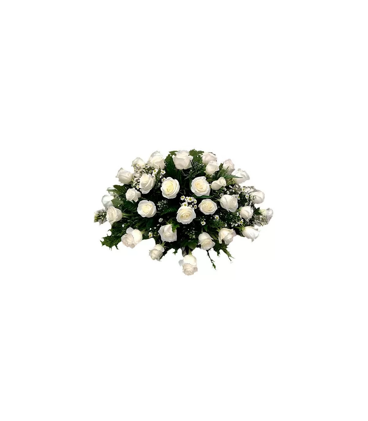 Nuestro cubre urna con 30 rosas blancas es el tributo perfecto para despedir a un ser querido con serenidad y pureza. Las rosas blancas simbolizan la paz, el amor incondicional y el respeto profundo, haciendo de este arreglo floral una opción ideal para rendir homenaje en momentos solemnes. Cada rosa es un reflejo de tus sentimientos más sinceros y una forma hermosa de mostrar tu cariño eterno.