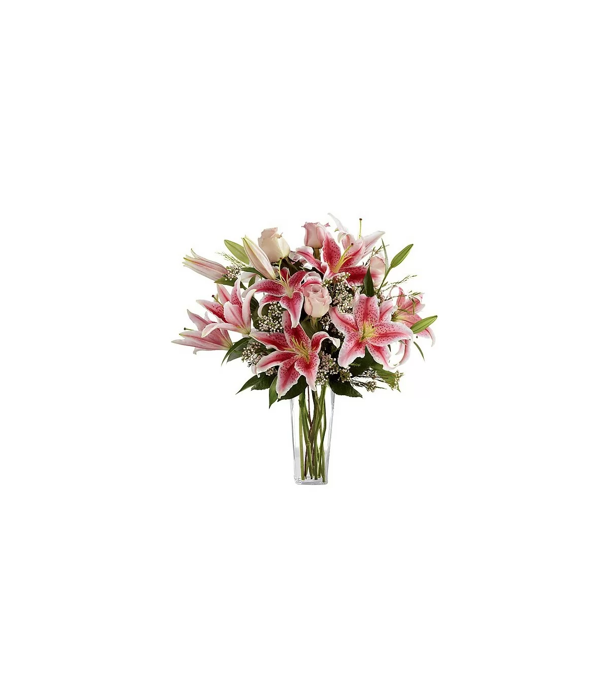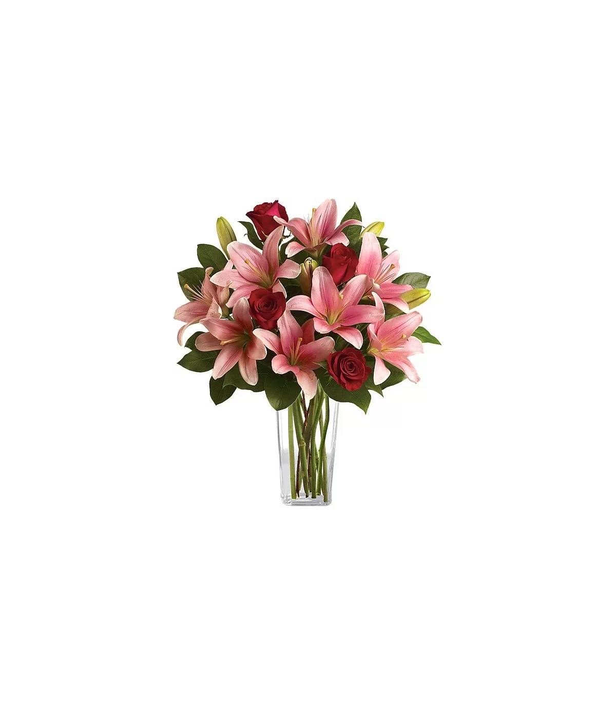 Envíe este hermoso florero de rosas y liliums a un ser querido para mostrar tu aprecio o simplemente porque sí. Es la sorpresa perfecta para cuando estás en casa o fuera de la ciudad.