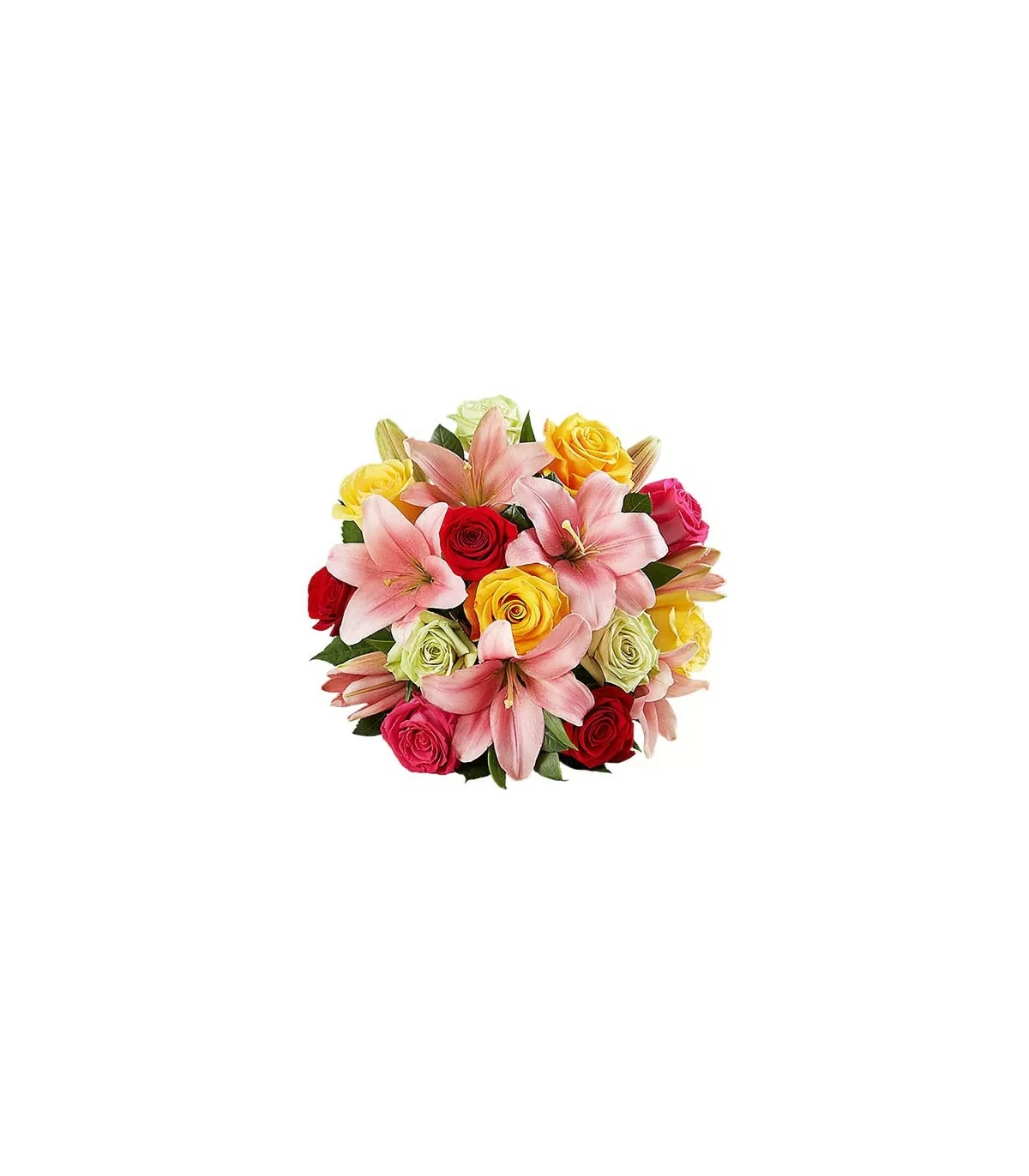 Las rosas y los liliums en este hermoso ramo son la expresión perfecta de amor y ternura. Con 12 rosas surtidas y 9 liliums rosados cuidadosamente seleccionados, este ramo es el regalo ideal para transmitir tus sentimientos más profundos a esa persona especial.